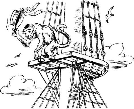 Обезьяна села на первой перекладине мачты, сняла шляпу и стала зубами и лапами рвать её. Она как будто дразнила мальчика, показывала на него и делала ему рожи.