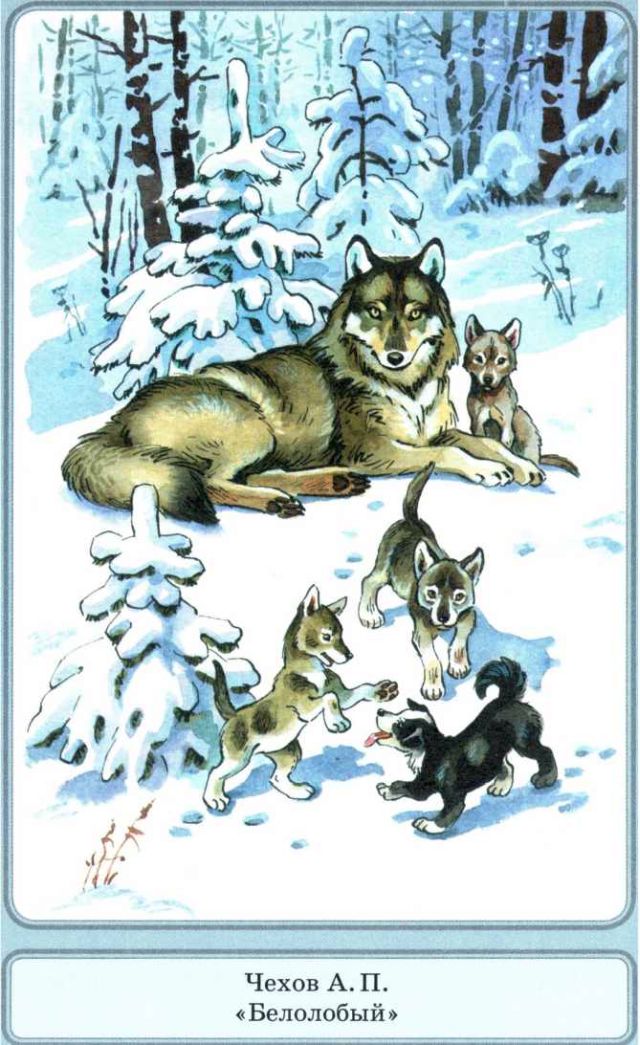 Наконец щенок утомился и охрип; видя, что его не боятся и даже не обращают на него внимания, он стал несмело, то приседая, то подскакивая, подходить к волчатам. Теперь, при дневном свете, легко уже было рассмотреть его… Белый лоб у него был большой, а на лбу бугор, какой бывает у очень глупых собак; глаза были маленькие, голубые, тусклые, а выражение всей морды чрезвычайно глупое. Подойдя к волчатам, он протянул вперёд широкие лапы, положил на них морду и начал: