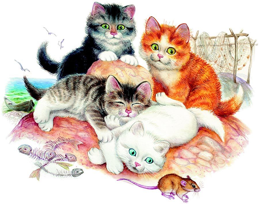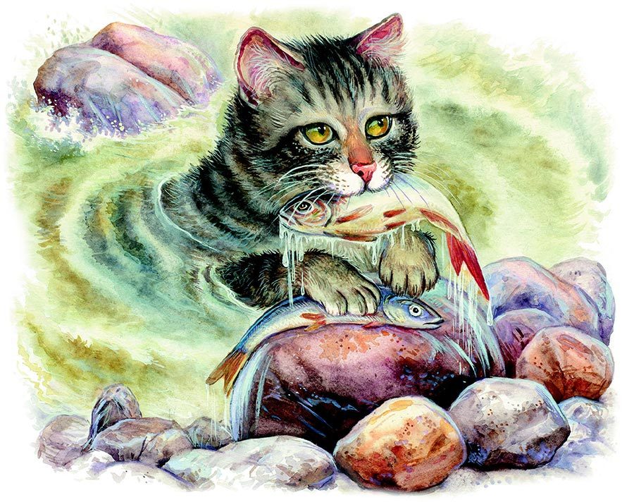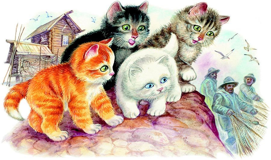 Кошка лапами нащупывала на дне мелкую рыбёшку, что уходила из невода. Эти рыбки прячутся на дно, закапываются в песок – вот тут-то их и ловила Мурка. Нащупает лапкой, подцепит когтями и бросает на берег своим детям. А они уж совсем большие коты были, а боялись и ступить на мокрое. Мурка им приносила на сухой песок живую рыбу, и тогда они жрали и зло урчали. Подумаешь, какие охотники!