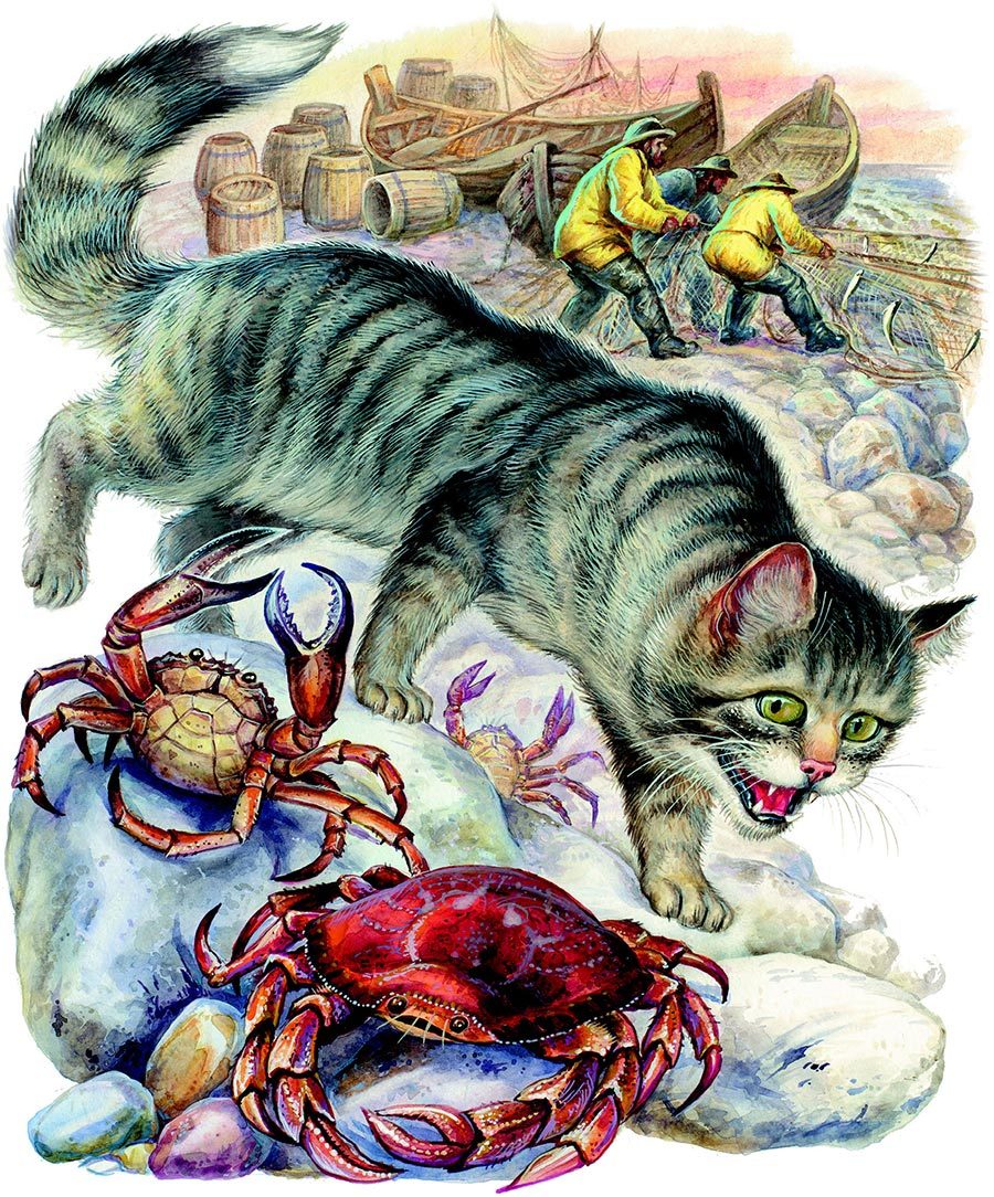 Они – как крупные пауки, ловкие, быстро бегают и злые. Они становятся на дыбы и щёлкают над головой клешнями: пугают. А если ухватят за палец, так держись: до крови. Вдруг я смотрю: среди всей этой кутерьмы спокойно идёт наша Мурка. Она ловко откидывала крабов с дороги. Подцепит его лапой сзади, где он достать её не может, и швырк прочь. Краб встаёт на дыбы, пыжится, лязгает клешнями, как собака зубами, а Мурка и внимания не обращает – отшвырнёт, как камешек.