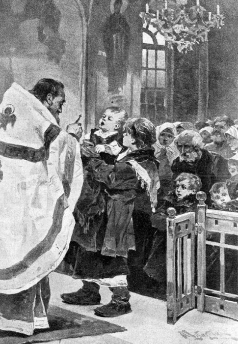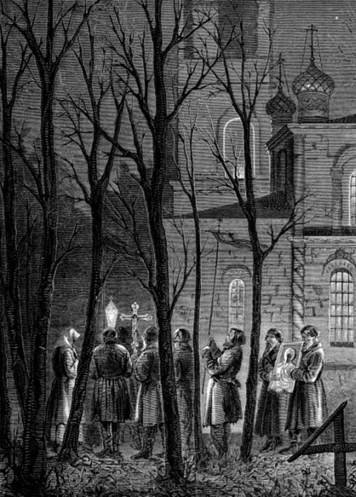 Ровно в полночь ударили в соборе в большой колокол: в других церквах ответили, и звон разлился по всему городу. На улицах послышалась езда экипажей и людской говор. Сон мигом соскочил с меня, и мы все вместе отправились в церковь. На улицах темно; но церковь наша горит тысячами огней и внутри, и снаружи. Народу валит столько, что мы едва протеснились. Мамаша не пустила меня с крестным ходом вокруг церкви. Но как обрадовался я, когда наконец за стеклянными дверями священники появились в блестящих ризах и запели «Христос воскресе из мертвых!». Вот уже именно из праздников праздник!