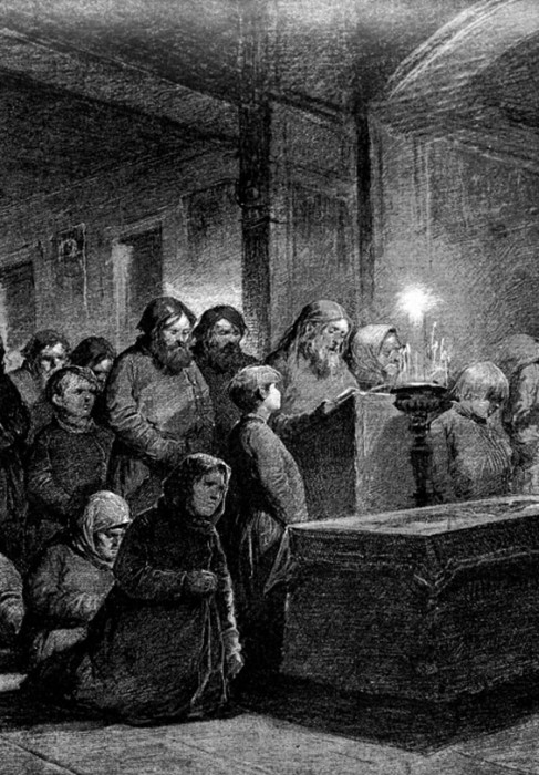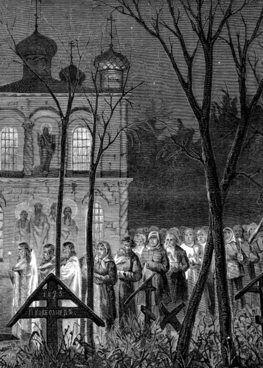 Так и просидели в избах до самой той поры, как пришло время идти в церкви. А церковные двери еще с вечера отворили. Свет оттуда идет на улицы от свечей в темную ночь. И великая настала тишина… Последние часы проходили и близили к заветному возглашению Великой победной песни…