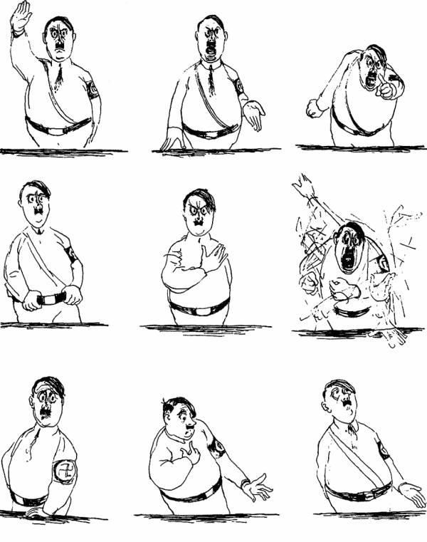 И вот однажды вечером дома Херлуф услышал по радио речь германского фюрера. Странная манера говорить этого человека так поразила Бидструпа, что в его голове мгновенно сложилась серия карикатурных рисунков нацистского оратора. Один из знакомых Бидструпа, увидев заразительно-смешные рисованные пародии на Гитлера, порекомендовал Херлуфу предложить их антифашистскому журналу «Культуркампен». Снабжённые цитатами из речи Гитлера работы доселе никому не известного художника, тем не менее, были немедленно напечатаны в этом издании. Заголовок к карикатурам гласил: «Рисунки Бидструпа. Текст Адольфа Гитлера».