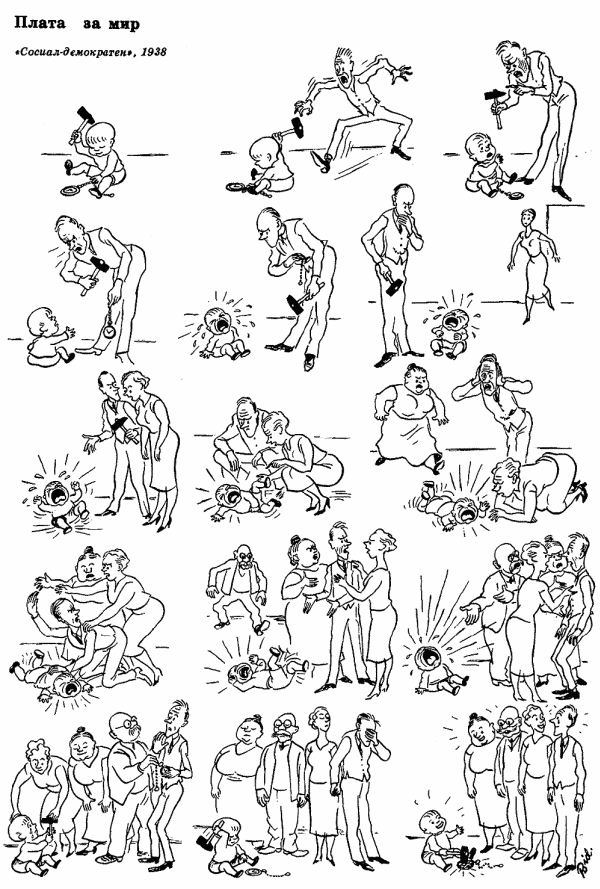 Бидструп выразил своё отношение к происходящему в серии рисунков под названием «Плата за мир». Но так как напрямую называть вещи своими именами художник не мог, он прибегнул к иносказательному эзопову языку. На карикатуре добрый дедушка (Чемберлен), пытаясь успокоить истерически орущего мальчишку (Гитлера), разрешает ему разбить часы (захватить Чехословакию).