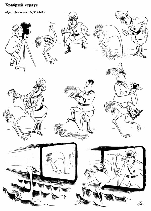Очень знаменитая карикатурная серия той поры называется «Храбрый страус». В ней Бидструп выражает своё отношение к правительству Дании времён оккупации. Когда немцы в апреле 1940 года напали на Данию, то правительство, подобно страусу, спрятало голову в песок. Затем показано, что захвативший страну фюрер делает с «датской птичкой»: вырывает перья из хвоста, катается на ней верхом. Зато когда фашисты были на всех фронтах разгромлены, расхрабрившийся страус клюнул Гитлера в нос, да и то не самого фюрера, а лишь его изображение на киноэкране.