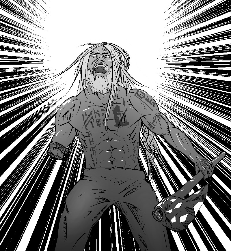 Затем папа схватил его топор и крепко сжимая его в левой руке закричал, и крик его был подобен грому черного медведя, извергающего молнии в ночных тучах.