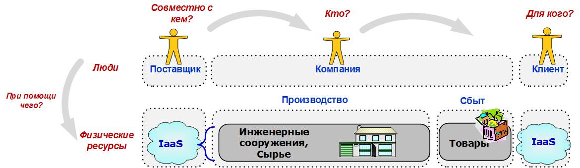 Чуть более сложной картина становятся в товарно-производственных отношениях. Здесь велика роль задействованных физических ресурсов и физических товаров, представляющих самостоятельную ценность для клиентов.