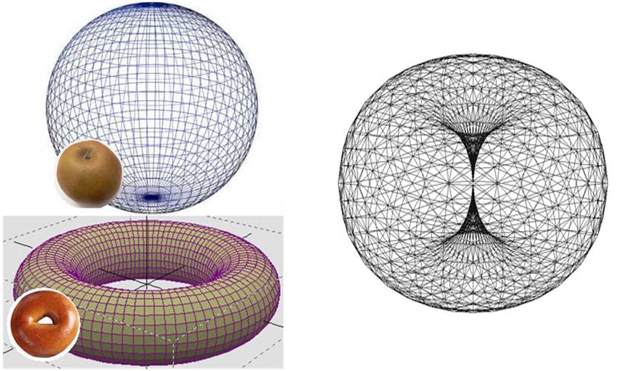 Сам собой напрашивается вывод, а может быть и не стоит формулировать такую теорему? Ведь, если принимать квантовое устройство мира, то такого рода фигура, в крайних точках неопределенности, может одновременно быть и сферой, и тором (рис.б), переходя в устойчивом виде то в одно, то в другое состояние. В качестве примера вопрос. Наша Земля – это шар или тор? Конечно же шар, скажет среднестатистический человек и покажет снимки, сделанные из космоса. Но если поверхность Земли – это чистая сфера, что же тогда представляют собой ее полюса, через которые проходит ось вращения? Просто две неподвижные точки или нечто большее? И почему эти две физические точки практически совпадают с магнитными полюсами, на которые указывает компас? Или все-таки Земля – это не шар, а сжатый тор? Или и то и другое одновременно? Посмотрите на форму яблока. По своей топологии, оно гораздо больше похоже на сжатый тор, нежели на сферу. Но в то же время оно имеет замкнутую поверхность. Сама природа, сама форма яблока дает подсказку о единстве этих двух фигур. Тогда за что-же был объявлен приз в один миллион? И существует ли теорема, или Пуанкаре вкинул потомкам головоломку, ответ на которую знал заранее?