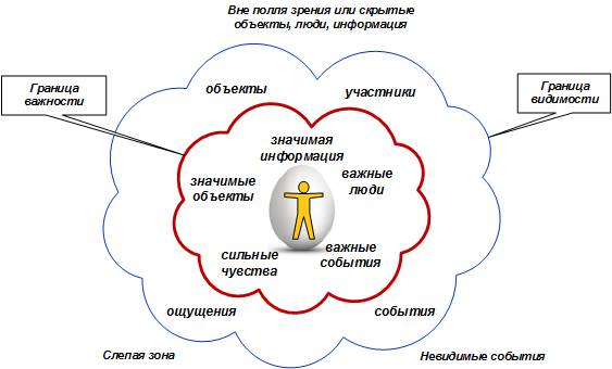 А что если изменить точку взгляда и начать смотреть на любую систему изнутри черного ящика наружу? Ведь в реальной жизни, мы всегда ищем свою точку опоры и ставим себя в центр системы, в центр той самой сферы, в центр того самого тора, наблюдая за происходящими вокруг событиями изнутри. Мелкие быстрые события и даже крупные, но неважные для нас события находятся где-то далеко на периферии, вне нашего фокуса. А важные, требующие принятия решений – близко к нам, близко к сердцу.