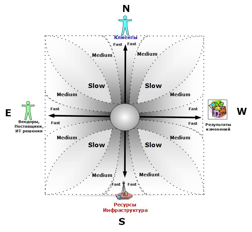 В таком компасе просматриваются все четыре фазы PDCA (Plan, Do, Check, Act) любого бизнес-цикла. Обычная деятельность Do, исходящая от обоих полюсов вертикальной оси, является своего рода раздражителем, требующим реакции с противоположной стороны. Клиенты своей деятельностью влияют на инфраструктуру и наоборот, изменения инфраструктуры тут же, как в зеркале, сказываются на деятельности клиентов. Между раздражителем и реакцией, всегда должна быть пауза, во время которой проходит процесс в горизонтальном направлении оси: Check – понимание ситуации, сбор, обработка и анализ информации, рефлексия и накопление опыта, Plan– подготовка и исполнение ответной реакции.