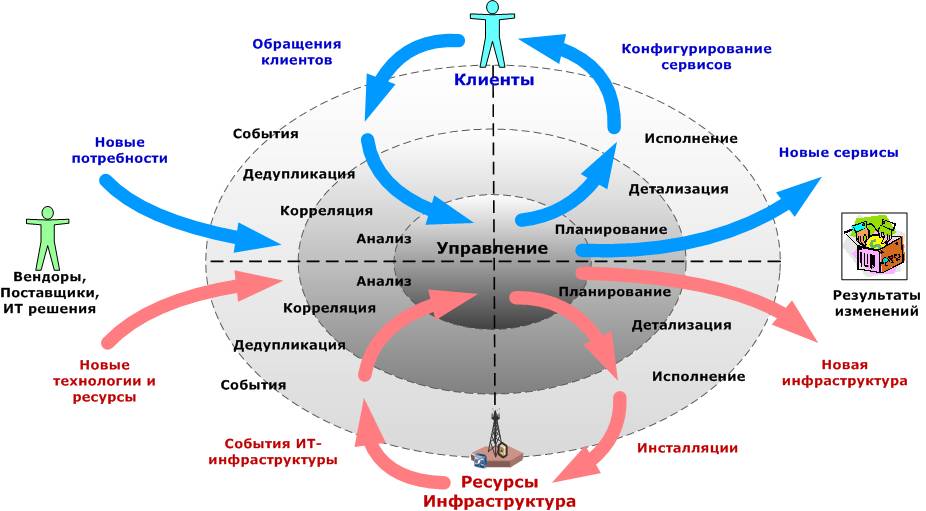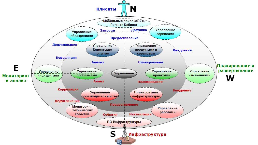 В этих единых процессах уже одновременно и симметрично учитываются события, происходящие на обоих полюсах – во фронт-офисе клиентов и в инфраструктуре. Наличие такой симметричной области – именно то, что крайне важно, и чего так не достает современному высокотехнологическому бизнесу, ориентированному на On-Line предоставление сервисов.