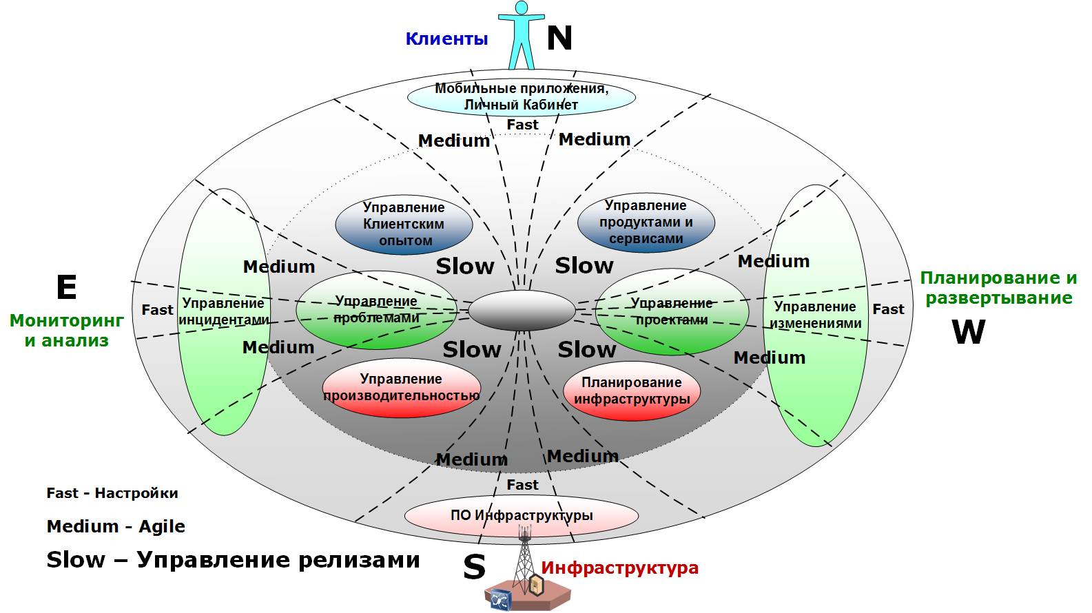 В верхней быстрой области изменений Fast, на полюсе клиента лежит настройка параметров сервисов самими клиентами через мобильные и веб-приложения. Если такой возможности нет, вы проваливаетесь в зону Medium с заявкой на выполнение сервисных работ. В нижней быстрой области изменений Fast, на полюсе инфраструктуры лежит настройка качества технического сервиса техническими специалистами. Конфигурирование технических параметров с целью улучшения качества сервиса не требует никаких крупных изменений в бизнес системах.
