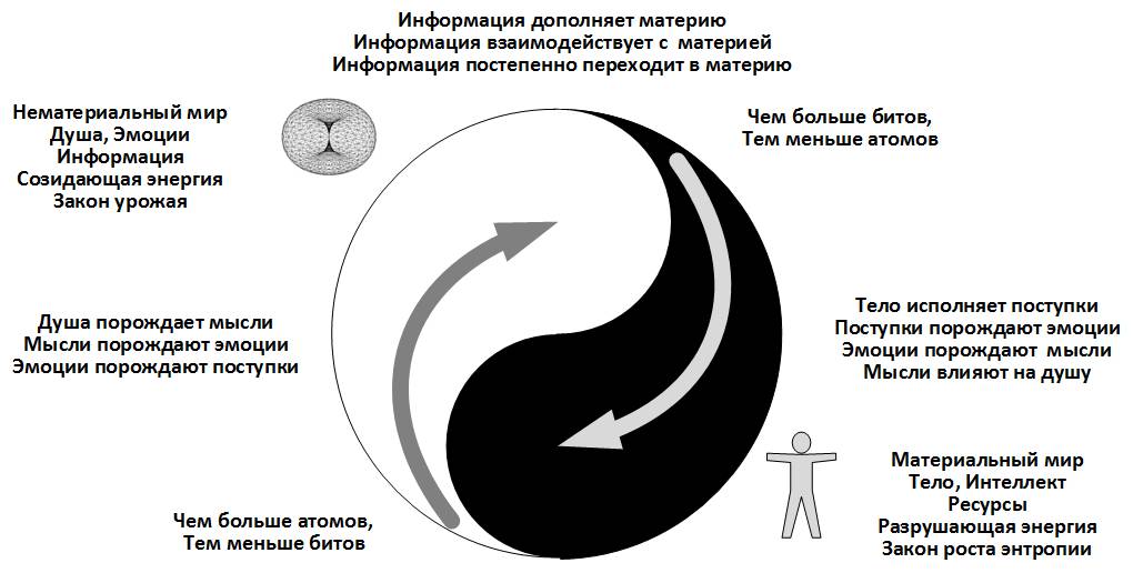 Но отсюда еще один потрясающий вывод. Когда-то, давным-давно материальной энергии не было накоплено так много, как сейчас. Все порождалось из одной точки и с очень малыми энергиями. Просто обе энергии, развиваясь, накапливали свой потенциал. Не правда ли, и люди, и корпорации живут по этим же законам – рождаются из ничего и превращаются в ничто, со временем. А нематериальный информационный мир – это не просто наше сознание, отражающее действительность. Это Энергетический созидающий поток по величине энергии в точности равный накопленной материальной энергии!