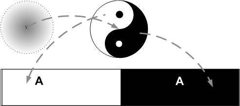 Однако, несмотря на то, что символ Инь-Ян выглядит плоским, по сути он точечный и отражает две полярности, присутствующие в каждой отдельно взятой точке. Иными словами, любая черная точка, со временем обязательно инвертируется в белую. Если переходить от точки к линии, поверхности и пространству, этот же символ можно было бы отобразить в виде метафор, которые находятся у всех на виду: клавиши рояля, шахматная доска и футбольный мяч.