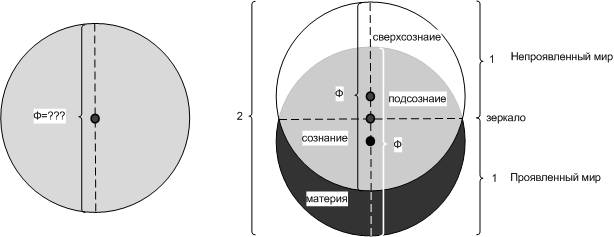 Иными словами, находясь в материальной нижней единичной половинке, я могу проявить только строго определенную часть нематериальной верхней половинки. Оставшаяся же верхняя часть всегда будет непроявленной внизу. И наоборот. Так что же это за пропорция? Зададимся двумя немного схожими вопросами: