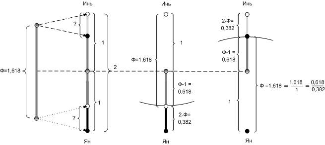 Один отрезок становится верхним и белым, а второй – нижним и черным. Инь и Ян смешиваются в пропорции Золотого сечения. Такой же результат можно получить, взяв отрезок длиной два и отсекая циркулем сначала снизу, а потом сверху диаметр равный «Фи» = 1.618…