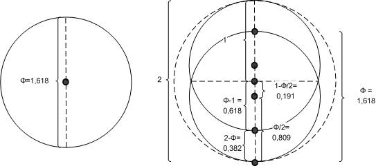 Более интересно это проявляется на плоскости. Окружность диаметра «Фи» растет до окружности диаметром два, одновременно порождая две подобные себе пересекающиеся окружности диаметра «Фи» – верхнюю и нижнюю, белую и черную.