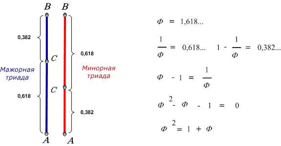 Рис. Мажорная и минорная триады. Свойства числа Фи.