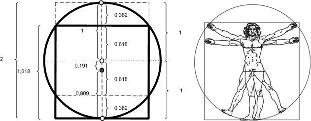 До визуального ощущения красоты мира, остался всего один шаг. Около окружности можно не только вписывать или описывать квадраты. Можно построить прямоугольник, одновременно вписанный сверху и описанный снизу. И здесь нас ждет «Бинго»!!! Это оказался не прямоугольник, а Золотой квадрат со стороной равной «Фи»!!! Так вот откуда великий Леонардо брал пропорции в своих картинах?!