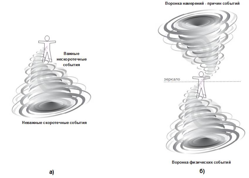 Ответ, как всегда пришел неожиданно. В воронке важности не хватало главного – сбалансированности. Как и многие другие, я видел в происходящих явлениях только их физическую составляющую, видел только поток физических событий. Но ведь у каждого события есть свои причины, а значит я, как и многие просто не замечаю этот встречный поток причин происходящих событий… Воронка должна быть симметричной! Этаким “Симметричным торнадо» (Рис.б)