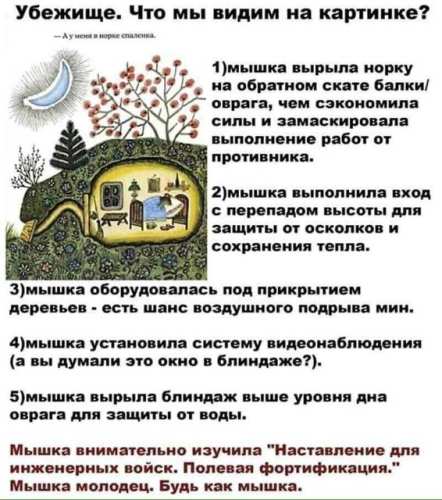 – Ну что ты… – палец жнеца лег на выполненное в разрезе изображение обители обсуждаемой героини. – Мышка умная! Вот посмотри: она вырыла свой блиндаж выше уровня дна оврага, чтобы защитить укрытие от воды. И место с умом выбрала – прямо под деревьями! Значит, есть неплохой шанс воздушного подрыва мин! А вход, обрати внимание, сделан с перепадом высоты – тепло сохраняет, да и от разлета осколков защитит! А раз она такая умная, думаешь, стала бы она делать в своем укрытии окна ниже уровня земли? Неа, брат шалишь! Точно тебе говорю – видеонаблюдение!