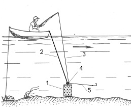Рис. 10. Ловля «кольцовкой»: 1 – кормушка; 2 – шнур кормушки; 3 – основная леска; 4 – «кольцо»; 5 – поводок с крючком.