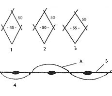 Рис. 13. Неравномерная посадка сети: 1 – зауженная ячейка (в верхней части сети); 2 – уширенная ячейка (в нижней части сети); 3 – симметричная ячейка (в средней части сети); 4 – положение нижней (А) и верхней (Б) подбор относительно друг друга (вид сверху).