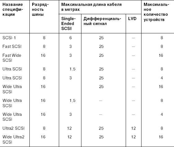 Таблица 6.1. Основные технические данные некоторых спецификаций SCSI-интерфейса