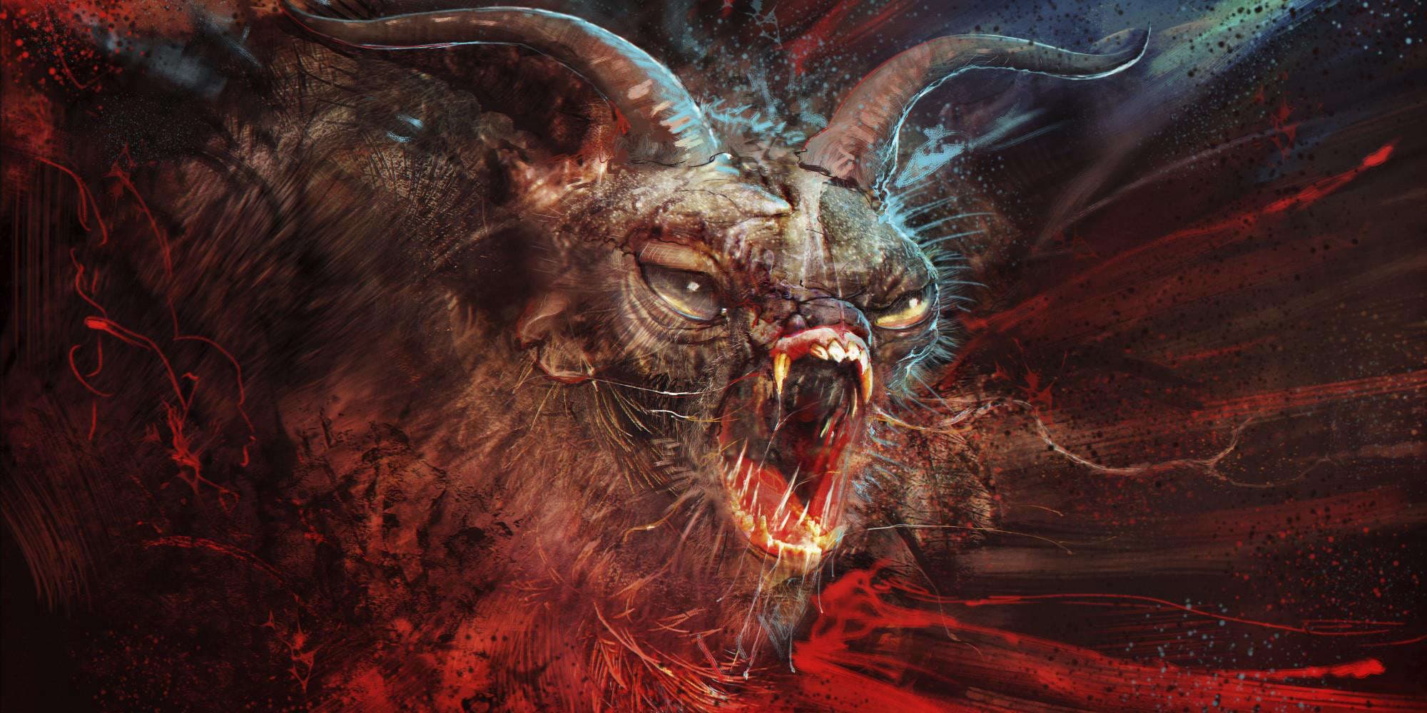 Вид у него был тот ещё. Тонкие длинные рога, копыта на задних лапах как у козликов, передние четырёхпалые лапы с пальцами почти как у человека. На пальцах короткие, но толстые когти на вроде волчьих или собачьих, пасть словно у кошки: короткая, но зубастая, с длинными когтями. Сразу видно, что хищник. Шерсть длинная, но росла клочками. Глаза крупные, с круглыми зрачками.