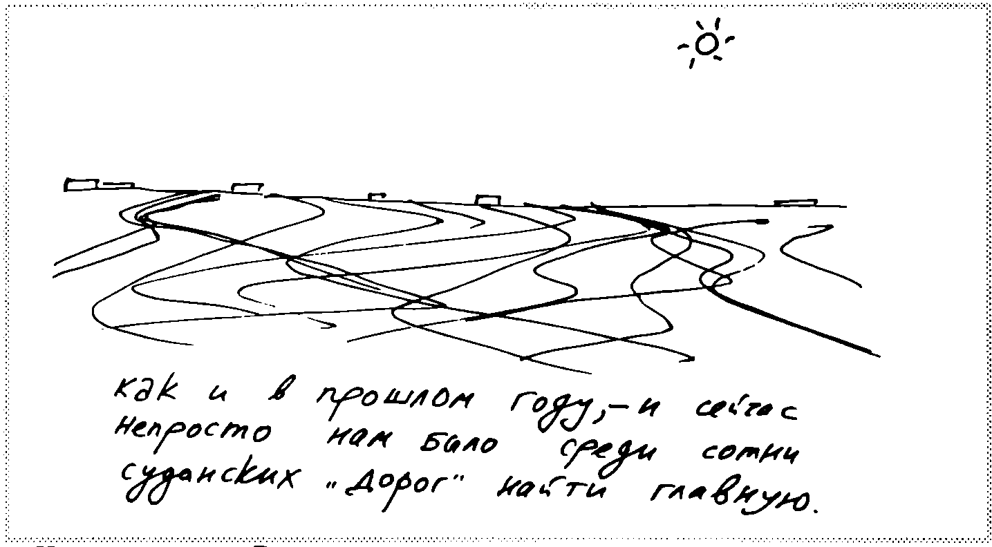 Как и в прошлом году, между портом и основной деревней находилась лишь растрескавшаяся земля и развалины глиняных домов, когда-то размытых половодьем. Было очень тепло. Мы зашли в один из домов уточнить дорогу, и сразу нас зазвали внутрь на отдых, чай и угощение. Мне было приятно попасть вновь на суданскую землю, где принято зазывать и угощать путников; Гриша и Кактус тоже возрадовались. Нам предлагали и переночевать, но мы отказались и, отягощенные пищей, потащились по песчаным улицам в сторону указанной нам трассы.