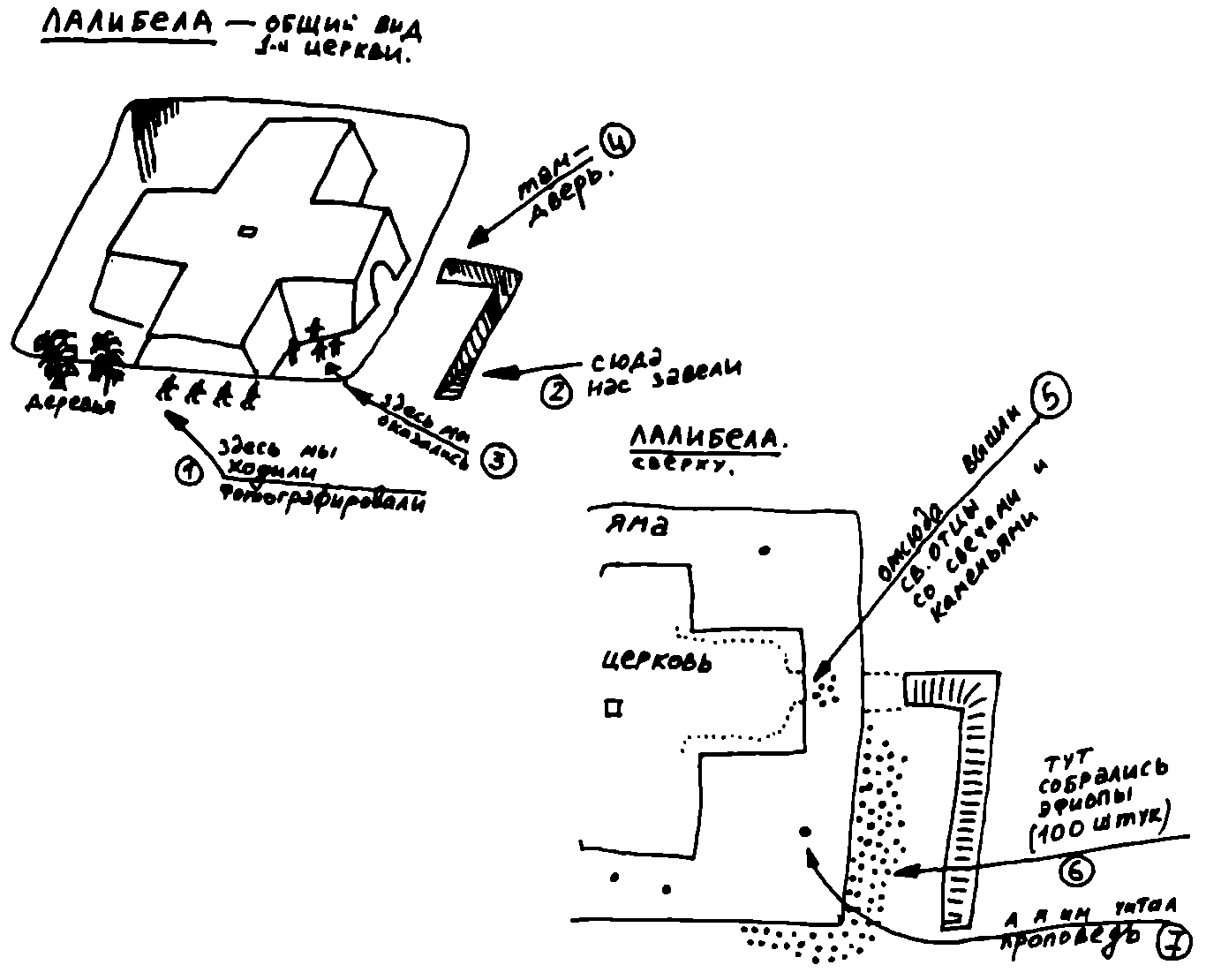 Мы решили испросить благословения посетить церкви бесплатно. Главный лалибельский епископ, он же и главный менеджер по сбору доходов, чернобородый эфиоп в длинной мантии, отказал нам и даже разговаривать с нами не хотел, подослал помощника сказать нам: берите, мол, билеты, и без разговоров! Мы пошли к начальнику лалибельской полиции, но тот отвечал: это церковные дела. Если бы у нас были специальные полицейские церкви, мы бы могли вам разрешить, но церковь в нашей стране отделена от государства; а в Лалибеле более трёхсот монахов, у которых единственный источник дохода – билеты!