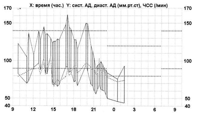 Лет 10 назад коллега попросила проконсультировать свою маму по поводу повышенного давления (кстати, сама мама – терапевт поликлиники!). На момент нашей встречи давление у нее было 120/90 мм рт. ст – не бог весть что, согласитесь. Для того чтобы понять, если ли у нее действительно проблемы с давлением, я повесил ей монитор для суточного измерения АД. Дальше смотрите сами: в 14 часов давление поднимается до 145/100 мм рт. ст, она в испуге пьет коринфар. Давление снижается на 2 часа, но затем поднимается до 160/90 мм рт. ст Пациентка вызывает «скорую», ей вводят магнезию, давление снижается до 115/70, затем снова повышается до 150/95 мм рт. ст Она снова вызывает «скорую», ей снова вводят магнезию и еще один сильнодействующий препарат. Результат вы можете видеть – падение давления до 80/45 мм рт. ст и двухнедельное лечение в неврологическом отделении по поводу нарушения мозгового кровообращения.