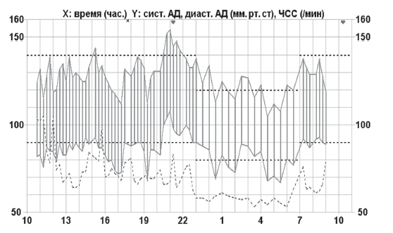 Каждая вертикальная палочка – это одно измерение. Верхний конец палочки – систолическое давление, нижний конец – диастолическое.