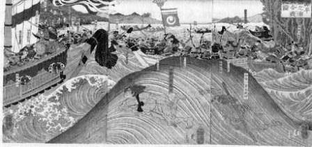 Рис. Битва Таира и Миналюто в заливе Данноура. Художник Цукиока Ёситоси.