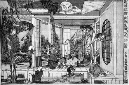 Знаменитому Кацусико Хокусаю принадлежит гравюра, изображающая как раз такой момент истины. Сотая история была рассказана, сотая свеча погашена, и можно позволить себе процитировать нашу классику: «Двери сорвались с петлёй, и несметная сила чудовищ влетела в божью церковь». Перед нами, конечно же, не церковь, но в остальном всё верно. Можно отметить, что байки травили семь человек. Один пытается спастись из дома бегом, двое – на карачках, оставшиеся делают вид, что они ни при чём, забившись по углам и прикрыв головы руками, как бы реализуя детский метод защиты: «я в домике». Твари появились сразу со всех направлений. Среди них явственно узнаётся юрей, зависший над полом, и Рокуро куби, засевший на крыше в компании пушистого оборотня. Остальные чудища не поддались точной классификации. Сложно сказать, чем закончится этот вечер; не исключено, что вся суматоха затеяна, чтобы дать людям то, ради чего они собрались этой жаркой ночью, а именно – приятную дрожь в теле, холодный пот и полную глотку безумного крика!