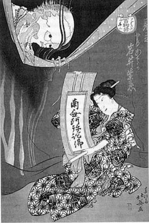 Но Кохада не успокоился. Однажды ночью О-Цука проснулась и увидела, что край москитной сетки слегка сдвинут и в образовавшемся отверстии маячит полуистлевшая голова её бывшего супруга. Можно представить, на сколько улиц вокруг был слышен радостный крик вдовы. Бывали ночи, когда зловещий силуэт появлялся рядом с ложем любовников, не оставляя тем возможности как-то наладить личную жизнь. Именно такой момент запечатлел на своей гравюре великий Хокусай. Изрядно разложившийся Кохада, отодвинув москитную сетку, пристально смотрит куда-то за край гравюры. Очевидно, именно там расположились невидимые для нас счастливые любовники. Интересно, что существует гравюра, созданная Сюнбайсаем Хокуэем, копирующая произведение Хокусая. В композицию добавлена злополучная О-Цука, вцепившаяся в некий лист, украшенный размашистыми иероглифами. Очевидно, это тот самый свиток с защитным заклинанием, о котором говорилось выше. Сам юрей увеличился в размерах и напоминает усопшего великана.