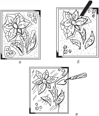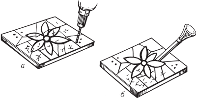 Работу по обработке рисунка следует начинать со сверления (рис. 8 а), затем по карандашным линиям выполнить гравировку (рис. 8 б). После чего можно скалывать скорлупу на тех участках панно, которые отведены под фон (рис. 8).