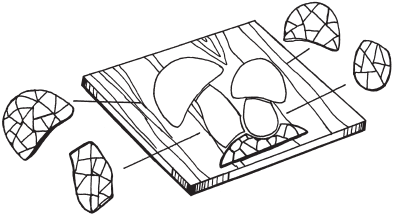 В начале работы над мозаичным набором надо перевести подготовленный рисунок на деревянную основу. Затем из листов с наклеенной скорлупой ножницами вырезать обобщенные силуэты из скорлупы и наклеить их на основу (рис. 9 а). Подождать, пока клей полностью высохнет, после чего удалить лишнюю скорлупу скальпелем или резаком (рис. 9 б). Очень часто следы от резака остаются на поверхности фона и портят ее, на больших участках такой изъян очень бросается в глаза. Такие изъяны легко убрать при заполнении фона слоем специальной мастики вровень с приклеенной скорлупой (рис. 9 в).