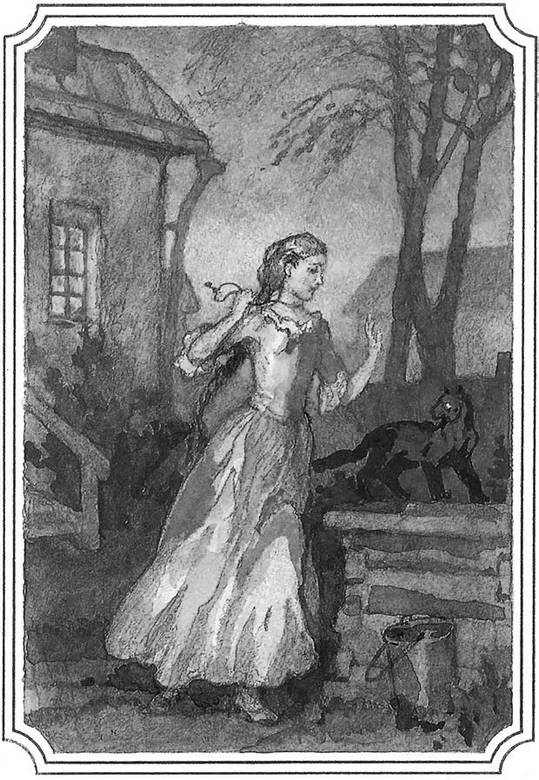 Лишь только смерклось, Маша тихонько сошла с лестницы – и направила шаги прямо к колодезю. Едва вступила она на двор, как вдруг вихрь поднялся вокруг нее, и казалось, будто земля колеблется под ее ногами… Толстая жаба с отвратительным криком бросилась к ней прямо навстречу; но Маша перекрестилась и с твердостию пошла вперед. Подходя к колодезю, послышался ей жалостный вопль, как будто выходящий с самого дна. Черный кот печально сидел на срубе и мяукал унылым голосом. Маша отворотилась и подошла ближе; твердою рукою сняла она с шеи шнурок и с ним ключ, полученный от бабушки.
