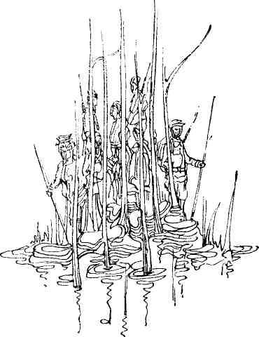 На краю болота рос молодой осинник. Каждый из путников вырезал себе жердь. Если кто-то провалится, жердь поможет удержаться ему на поверхности, пока не подойдут остальные и не вытянут из трясины.