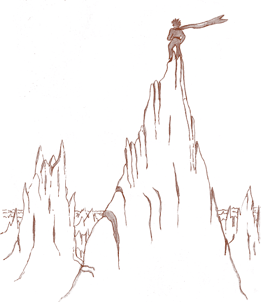 Маленький принц поднялся на высокую гору. Прежде он никогда не видал гор, кроме своих трёх вулканов, которые были ему по колено. Потухший вулкан служил ему табуретом. И теперь он подумал: