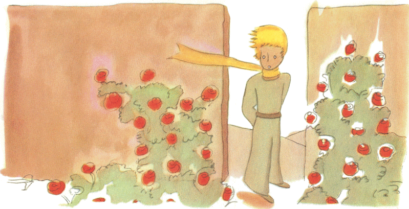 А потом он подумал: «Я-то воображал, что владею единственным в мире цветком, какого больше ни у кого и нигде нет, а это была самая обыкновенная роза. Только всего у меня и было что простая роза да три вулкана ростом мне по колено, и то один из них потух, и, может быть, навсегда… Какой же я после этого принц?..» Он лёг в траву и заплакал.