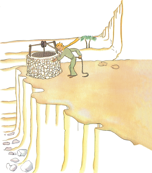– Да, – сказал я Маленькому принцу, – всё, что ты рассказываешь, очень интересно, но я ещё не починил самолёт, у меня не осталось ни капли воды, и я тоже был бы счастлив, если бы мог просто-напросто пойти к роднику.