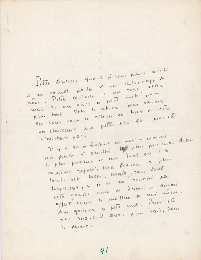 Детка Консуэло, когда я к вам так обращаюсь, мне кажется, я говорю с девочкой из сказки. Детка Консуэло, я чувствую, мне очень скверно. Письмо вам пишу для «потом». Вы его перечитаете. Узнаете, что долгими молчаниями, нерешительностью берегли очень маленькую девочку, которой, может быть, и не было.