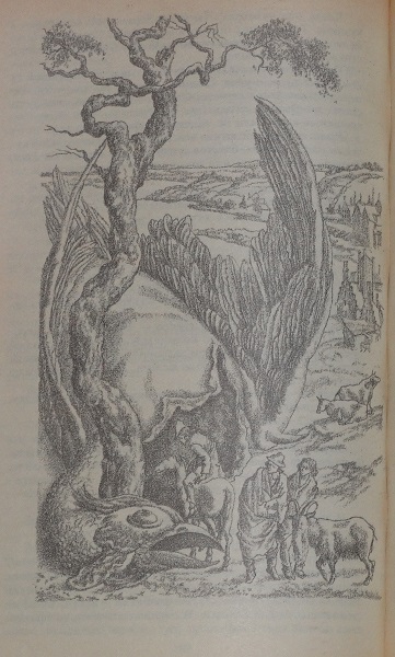 Тогда «зверь, который приносит ужас», тронулся в путь. Гром бьет своим хвостом в сто локтей длины тише, чем этот зверь опускает лапы на землю. Когда зверь дошел до леса, то проглотил лес, когда дошел до берега реки, проглотил реку. Не было для зверя преград, всюду зверь проходил. Когда дошел до горы, проглотил гору. Проглотил озеро, потом берег озера, запив болотцами с битыми горшками на дне; и вот зверь очутился у человечьей деревни, а поскольку петухи уже раскрыли было клювы, чтобы поднять тревогу, зверь проглотил всех петухов. Единым духом проглотил петухов. И тогда зверь снова обернулся птицей, но большой птицей, ночной птицей пепельного цвета, она взлетела на баобаб, что рос прямо посреди деревни.
