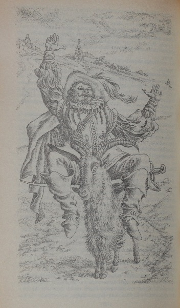 Без труда оседлав нового скакуна, солдат обнаружил, что ноги у него теперь волочатся по земле, и тогда ему пришла в голову мысль прикрепить свою длинную саблю поперек спины барана, как перекладину, и свесить через неё ноги, чтобы они не доставали до земли.