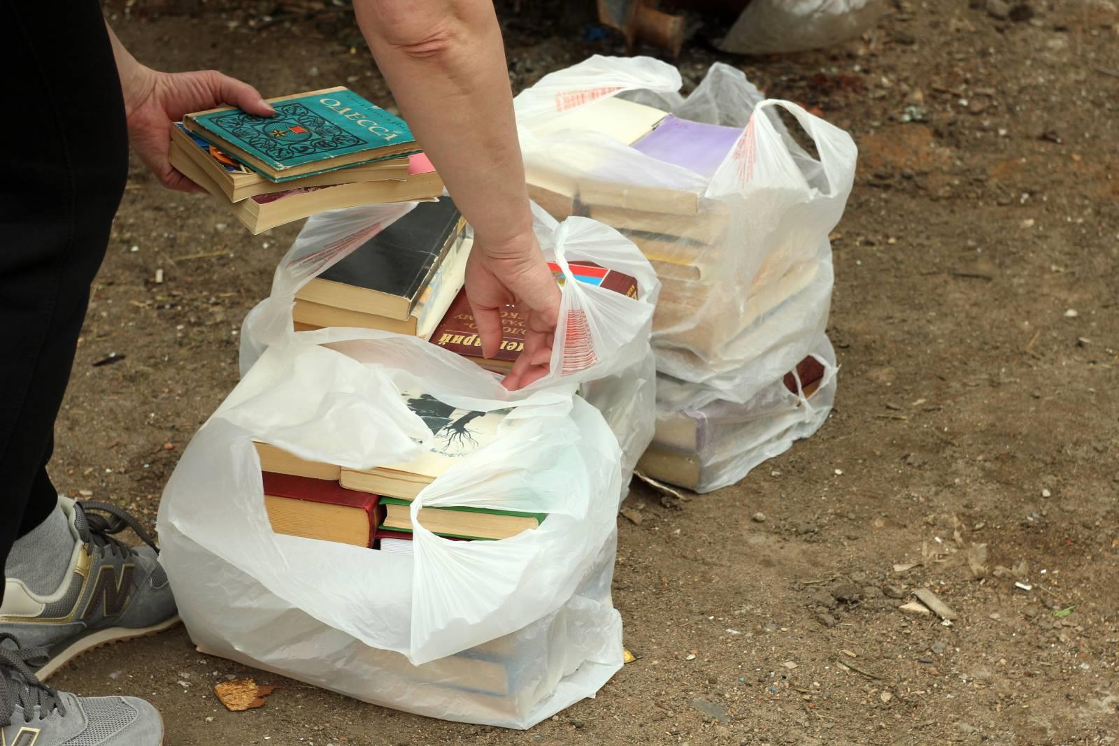 У другой помойки нас поджидал книжный развал. Часть книг уже были выложены на какой-то древней тумбочке, ещё два полных пакета лежали на земле.
