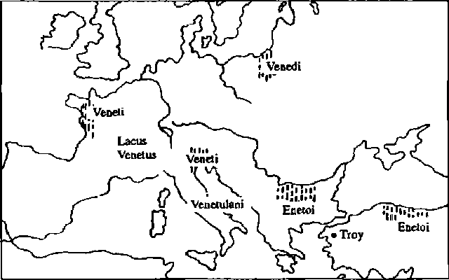Треугольник Адрия – Арморика – Балтика слишком велик, чтобы можно было предполагать взаимосвязь разных групп венетов на протяжении столетий, даже если они и происходили из одного корня. И все-таки тоненькие нити связей выявляются: это и своеобразная монополия торговли янтарем (Адрия и Балтика), и сходство образа жизни, и неизбежные встречи на море (Арморика и Балтика). Но и венетский слой, видимо, не является древнейшим во всех этих районах, и не с венетским языком должно, по всей вероятности, связывать и сам этноним.