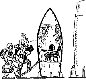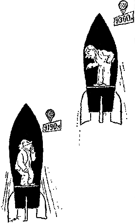 Второй пилот просто доверился расчетам конструкторов. Он вошел в кабину ракеты, чтобы вовремя полета самому наблюдать за работой двигателей и управлять снарядом. Его ракета поднялась на 1200 метров выше первой. Обладая большей массой, она накопила больше живой силы за то время, когда работали двигатели. Благодаря этому ракета второго пилота, после того как все горючее было израсходовано, пролетела по инерции значительное расстояние.