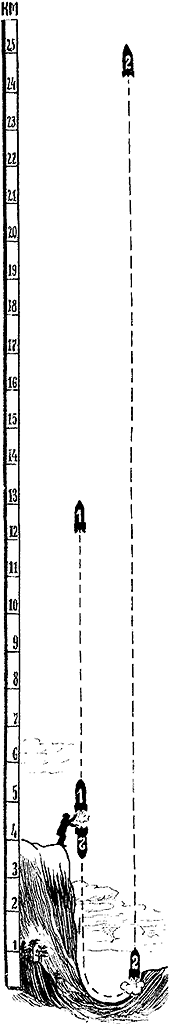 Возвратимся теперь к нашей статье. Газы, вылетевшие из сопла ракеты, запущенной вертикально, унесут с собо бо́льшую часть термохимической энергии топлива. Оставшейся энергии хватит лишь на то, чтобы сообщить ракете скорость, при которой она сможет взлететь всего лишь на 9 километров. Если же мы бросим снаряд в пропасть, мы создадим этим наиболее выгодные условия для работы ракетного двигателя: он начнет работать, когда снаряд уже достигнет большой скорости. Израсходованное же на нижнем уровне топливо отдает снаряду, как увидим ниже, часть своей первоначальной потенциальной энергии. Вследствие этого коэффициент полезного действия двигателя сильно повышается. В этом случае газы унесут меньше энергии. Остатка ее будет достаточно, чтобы поднять ракету на высоту 21 километра.